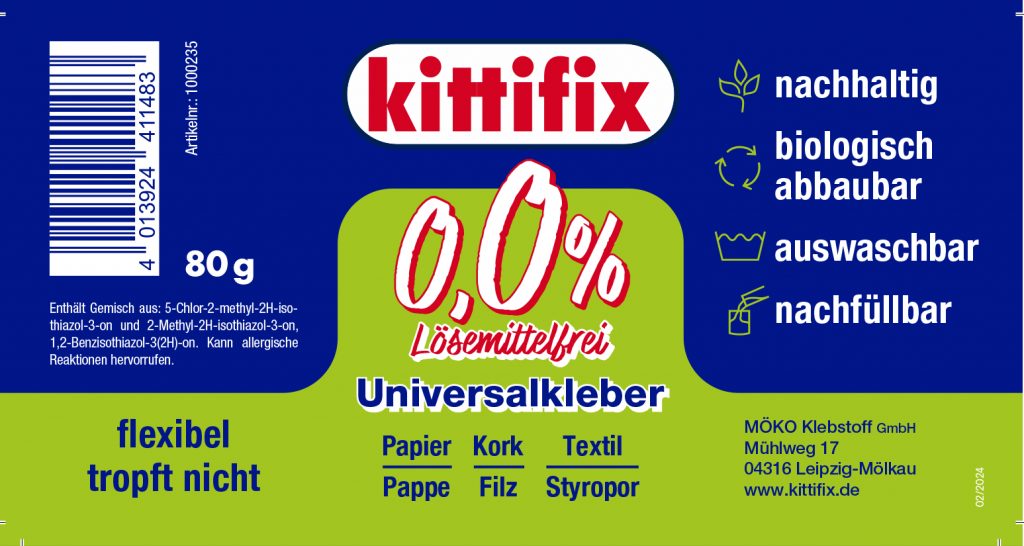 Der Bastelkleber ohne Lösungsmittel ist ein schnell abbindender Klebstoff, der für alle Arten von Bastelarbeiten geeignet ist. Er klebt alle gängigen Bastelmaterialien schnell und trocknet transparent. Kittifix 0,0% Lösemittelfrei Universalkleber klebt Papier, Karton, Leder, Stoff, Filz, Bast, Trocken- und Seidenblumen, Kork untereinander und auf vielen verschiedenen Kunststoffen, Metallen, Laminaten, Stein und Styropor®. Er kann auf fast allen Materialien verwendet werden, wenn einer der zu klebenden Teile porös oder saugfähig ist. Kittifix 0,0% Lösemittelfrei Universalkleber tropft nicht.