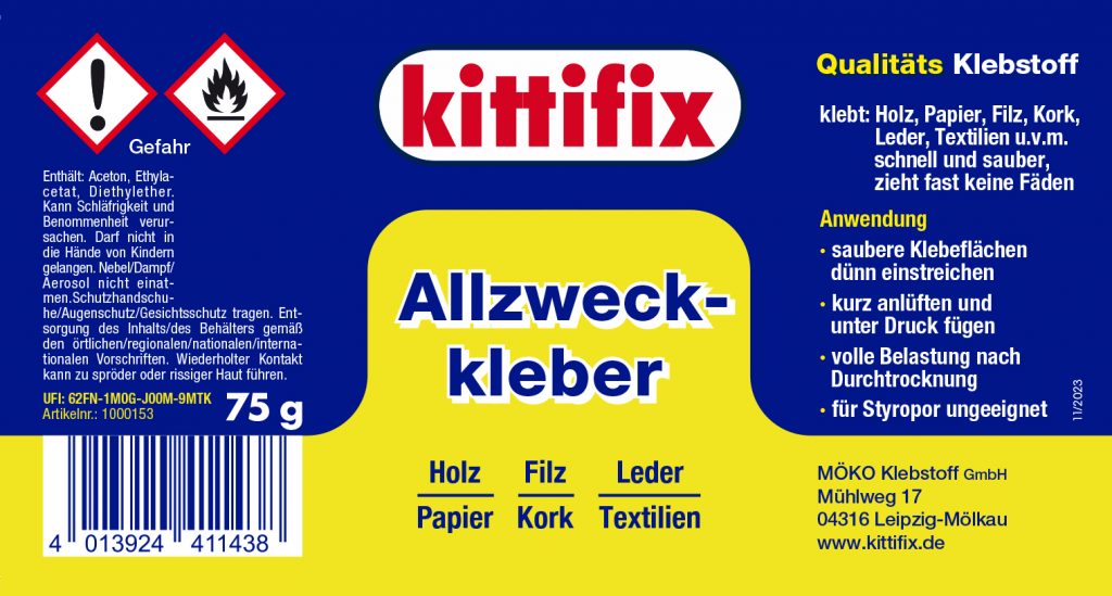 Kittifix Allzweckkleber ist ein Klebstoff auf Basis von Kunstharzen. Er ist einfach zu handhaben und damit vorzugsweise für Klebarbeiten im Haushalt, Büro und Werkstatt geeignet. Schnell und sauber, punktgenaues auftragen durch Maldüse. Zieht fast keine Fäden. Einsatzgebiete sind